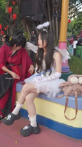 •  透明蕾丝天使裙美女,隔着裙子看到内裤,低角度CD。